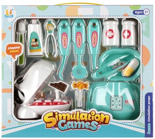 Dostępne: 2 Sztuk Lub zamów telefoniczne: 690 216 578Zalety produktu: Rozwijanie wyobraźni dziecka, rozwijanie pasji, nauka dbania o zdrowie jamy ustnej. Dzieci marzą aby w przyszłości wykonywać potrzebny i szanowany zawód Dentysty. Pozwól mu już teraz przygotować się do tej roli i poznać wszystkie aspekty pracy w służbie zdrowia. Z Zestawem MEGA CREATIVE dziecko będzie mogło pomóc swojemu pierwszemu pacjentowi! Zawartość zestawu: jama ustna psa, pasta i szczoteczka do zębów, termometr, lusterko dentystyczne, irygator ,pęseta, miseczka na naczynia dentystyczne, narzędzia dentystyczne. Całość wykonana z plastiku i kartonu. Wymiary/waga/baterie: wymiary produktu (dł. x wys. x gł.)[cm]: 10x9x8 , wymiar opakowania (dł. x wys. x gł.) [cm]: 27x23x8, waga produktu bez opakowania [kg]: 0,09 kg, waga produktu w opakowaniu [kg]: 0, 24 kg, nie wymaga zasilania bateriami. Zestaw przeznaczony dla dzieci w wieku: 3+. Pakowany w kartonik z okienkiem. W kartonie po 30 szt.