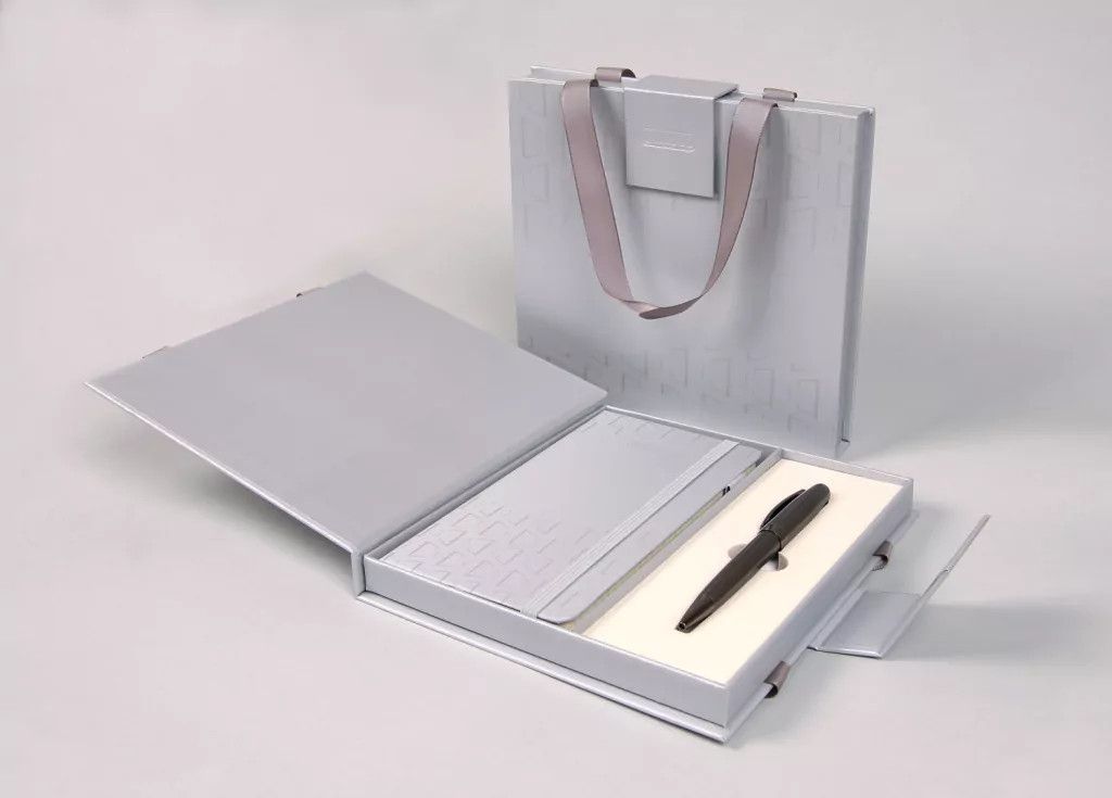 Dostępne: 4 Sztuk Lub zamów telefoniczne: 690 216 578Zestaw prezentowy w ciekawym opakowaniu imitującym torebkę prezentową. Komplet zawiera notes z gumką i wstążką oraz elegancki grafitowy długopis SYMPHONY. Zestaw upominkowy spakowany w kartonowe etui z zapięciem magnetycznym. Po zamknięciu opakowanie przybiera postać torebki prezentowej z uchwytami ze wstążki. Zatem po zakupie jest to gotowy prezent do wręczenia na różne okazje.