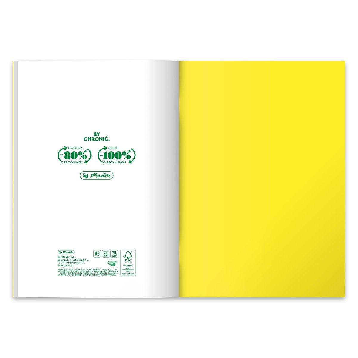 Okładka: wysokiej jakości polipropylen w jednolitym, soczystym kolorze, bardzo dobrze zabezpiecza wnętrze, 80% użytego surowca na okładkę pochodzi z recyclingu poprodukcyjnego, okładka w 100% podlega recyclingowi.